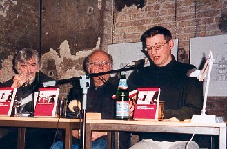 ![]() Buchpräsentation in der Hörsaalruine der Alten Charité Berlin, v.l.n.r.: Verleger Ulrich Hopp, Jochen Senf (alias Tatort-Kommissar Max Palü), Mani Beckmann |